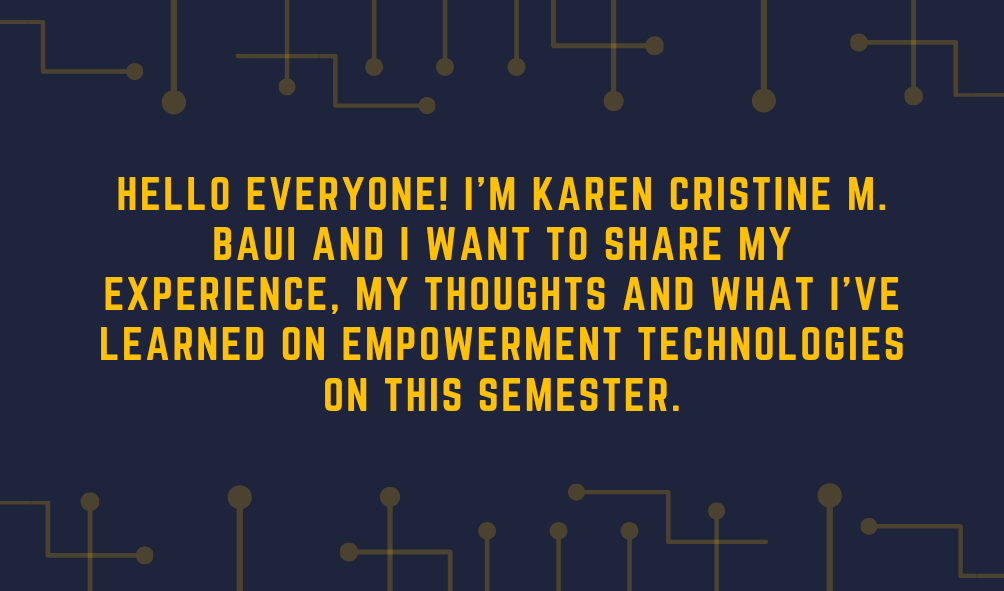 Empowerment technology subject was such a very hard and challenging subject for me however It teaches us/me about how to handle technology well, it gives tips, guidelines, etc. In this subject, I have learned a lot like how to make a blog, Powerpoint, Prezi presentation, what is the Internet all about, how to be safe online. This subject also helps me to know more about ICT or Information Communication Technology. I learned about the WWW or World Wide Web, internet, static and dynamic web pages, key features, semantic web, several problems about 3.0, mobile technologies, trends in ICT, mobile OS, how to be safe online, six types of social media, internet threats and many more are the lessons that we tackled and learn about. All of the lessons that I’ve learned here in this subject will help me a lot and I will apply them in my life.